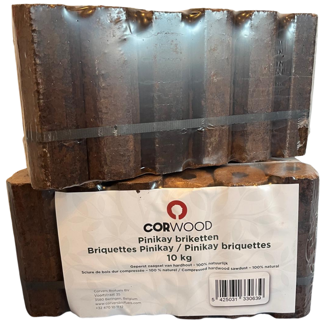 Pini Kay (pinikay) is een type houtbriket: samengeperst houtzaagsel dat onder hoge druk tot een harde briket wordt geperst. Het herken je meestal aan de cilinder/zeshoek-vorm met een gat in het midden. Dat gat helpt de lucht door de briket te laten trekken, waardoor hij doorgaans stabiel en gelijkmatig kan branden. Veel Pini Kay-briketten hebben ook een wat donkere/“gebrande” buitenkant door een (lichte) warmtebehandeling tijdens of na het persen.